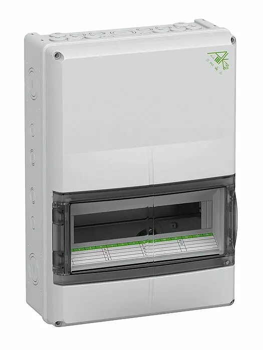 - Malý rozvádzač so stupňom krytia IP65, 1 rad, 14 dostupné moduly, s integrovanými ventilačnými prvkami na zmiernenie vytvárania kondenzačnej vody.